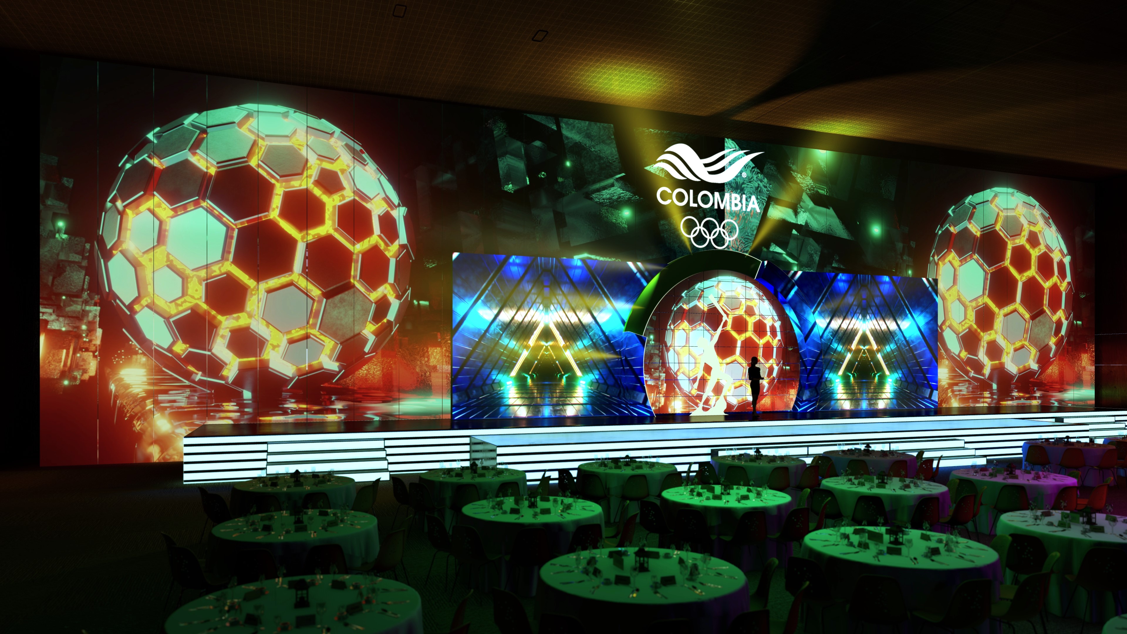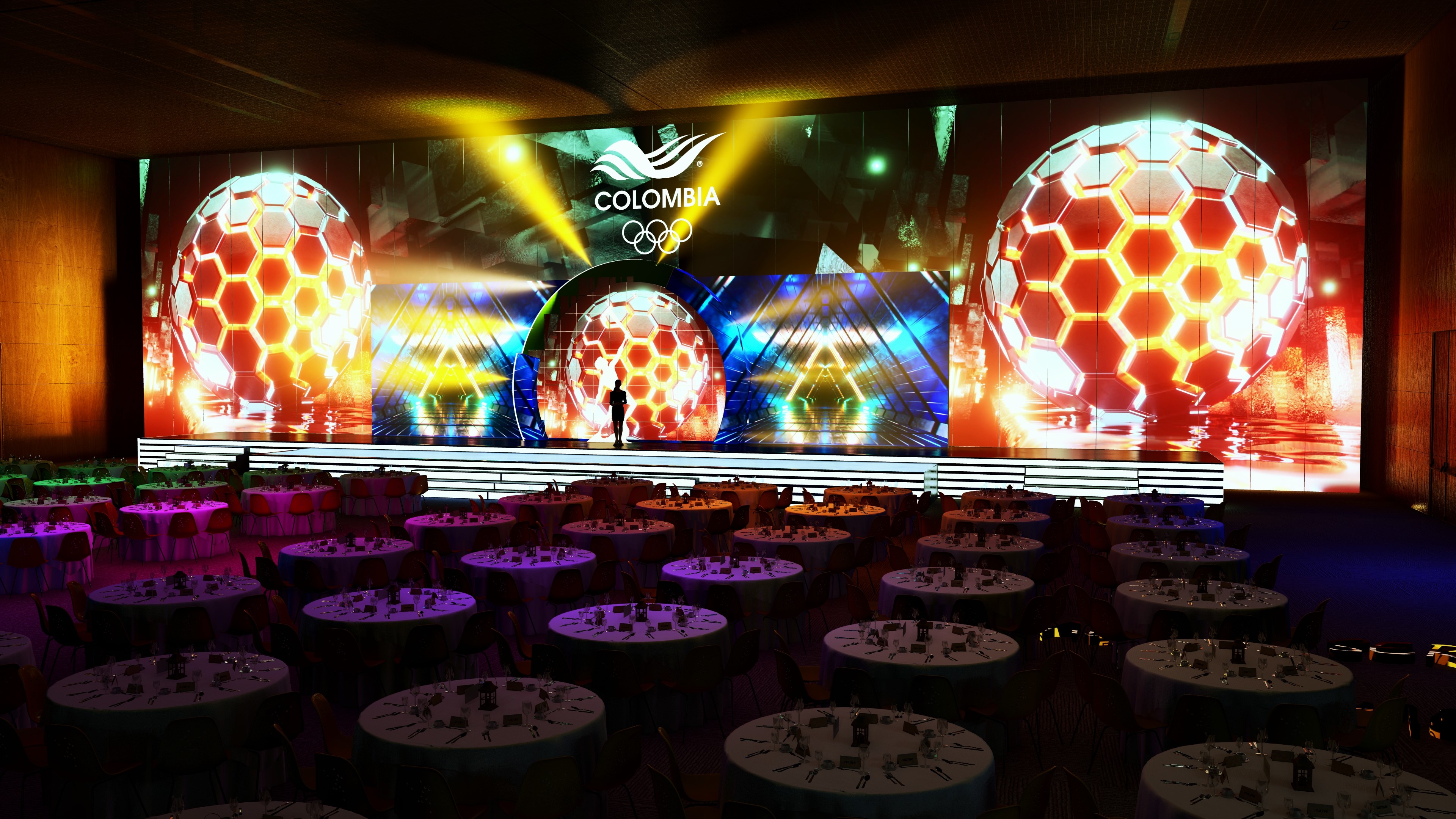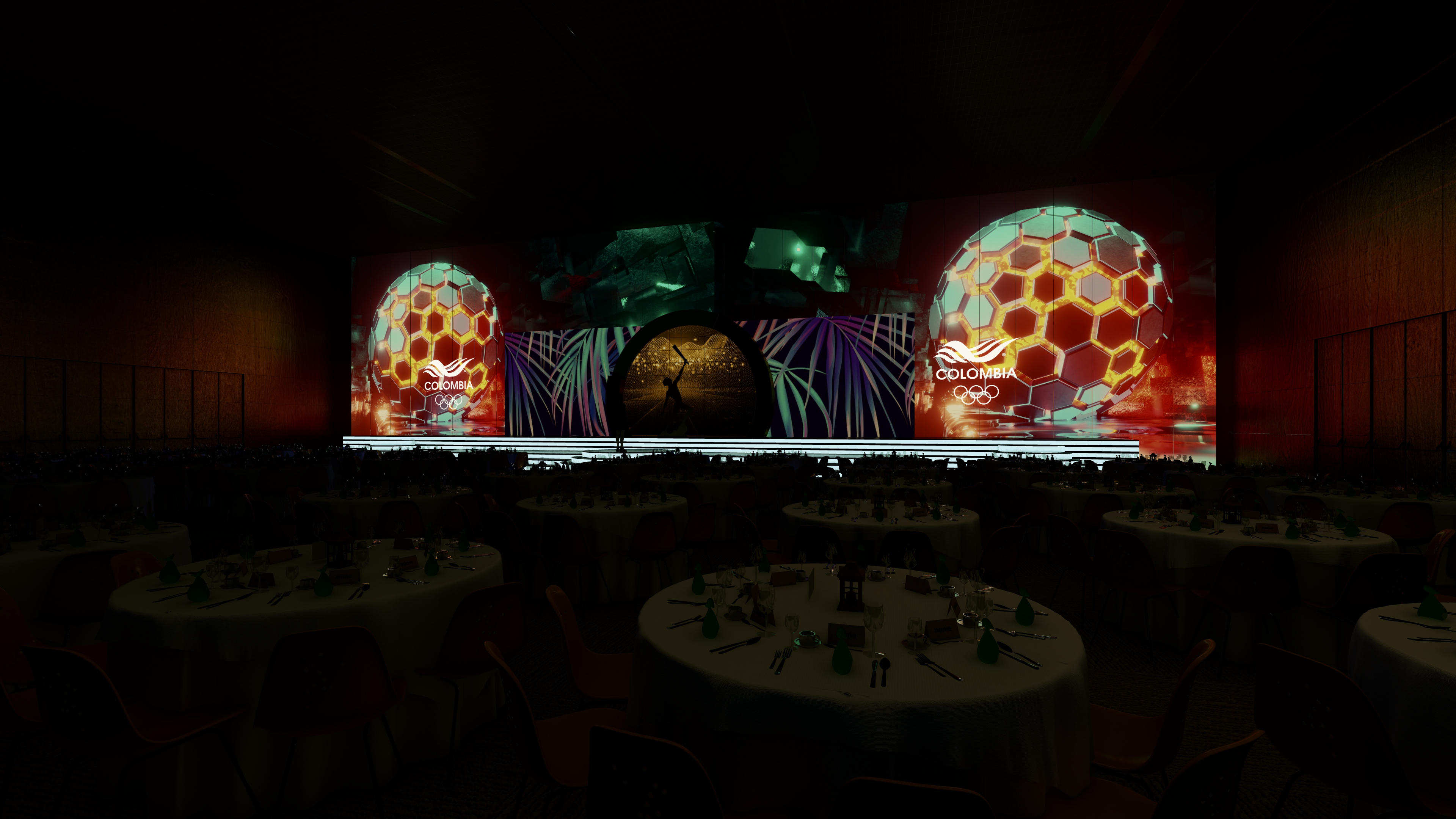 Proyecto de visualización arquitectónica y escenográfica para la ceremonia de los Premios Altius. El diseño destaca la integración de pantallas LED de gran formato y la disposición del mobiliario para un evento de gala de alto nivel.