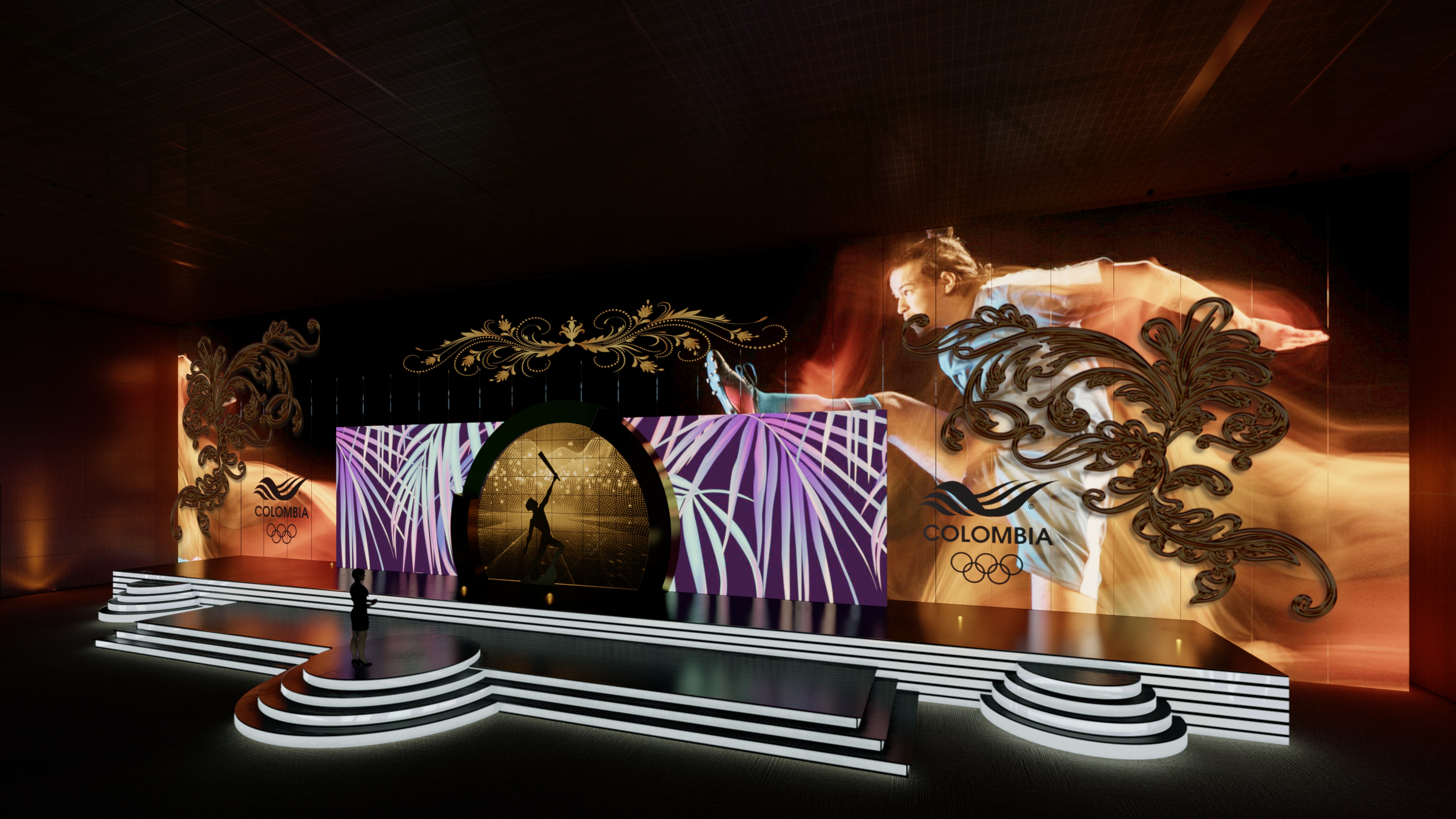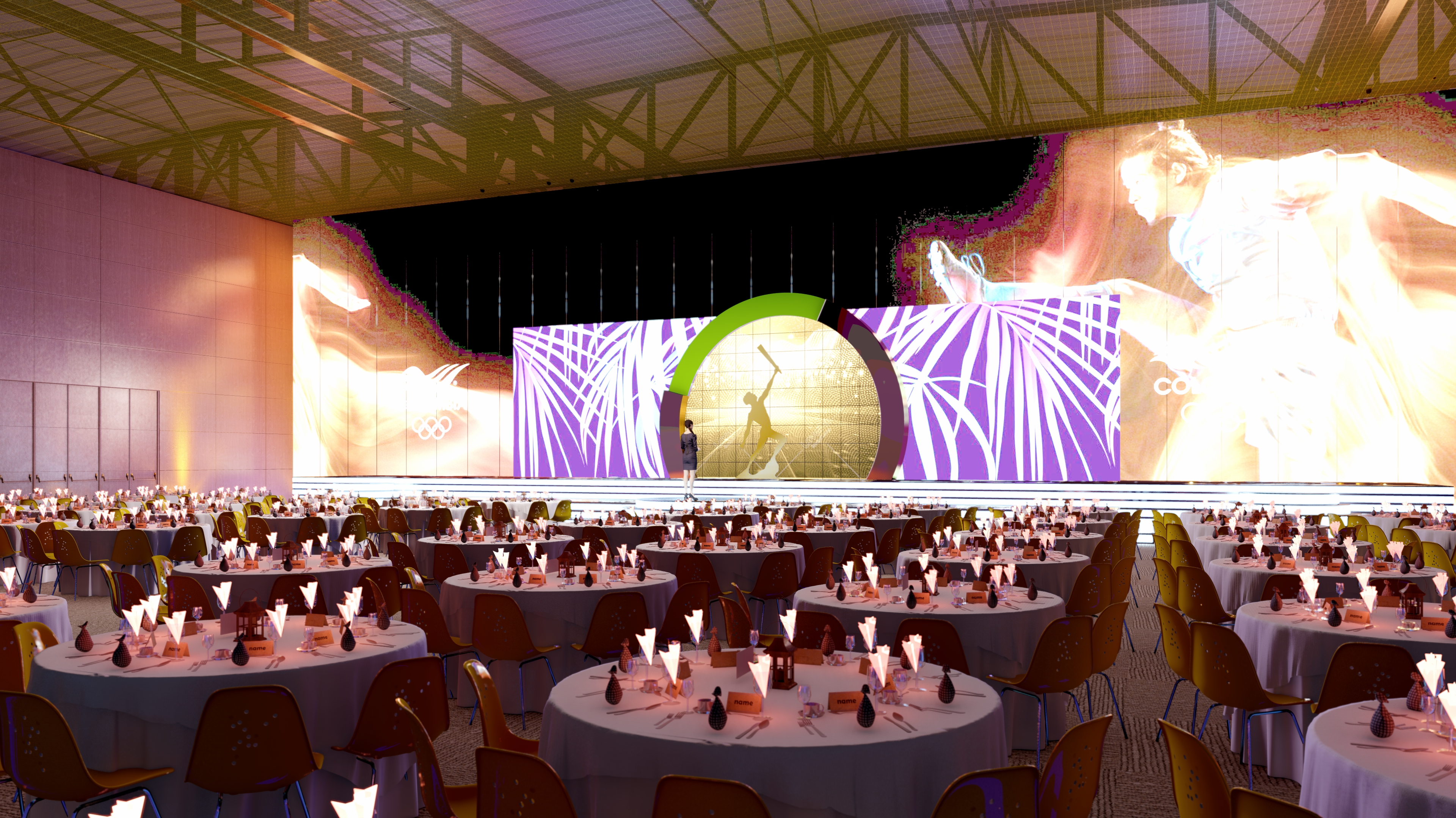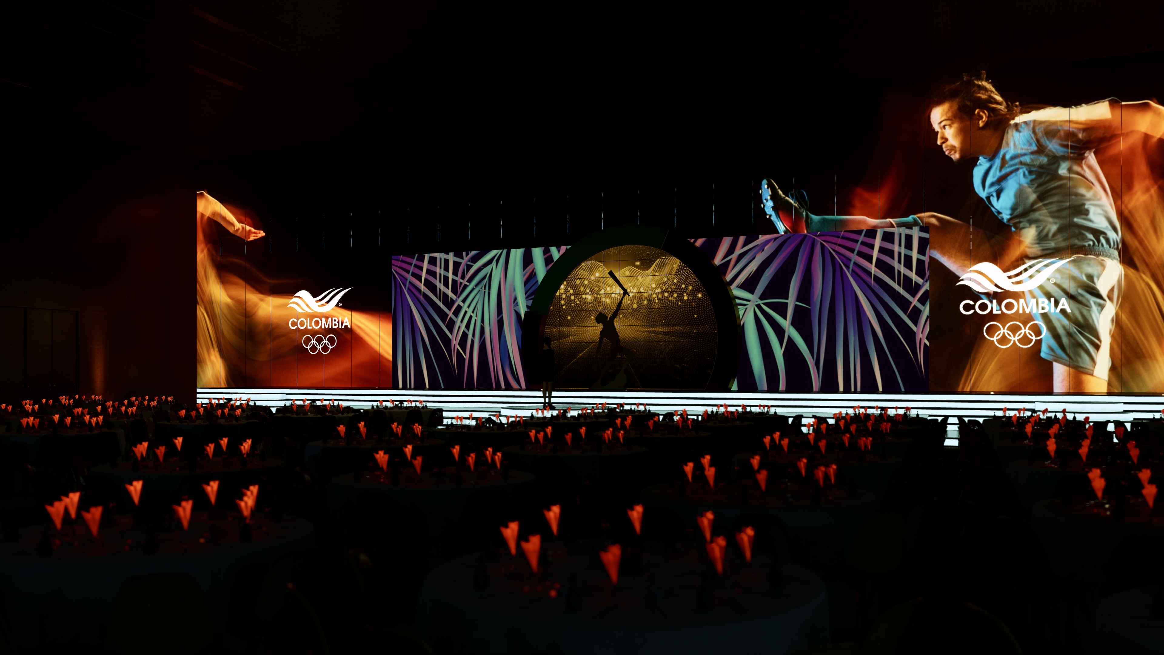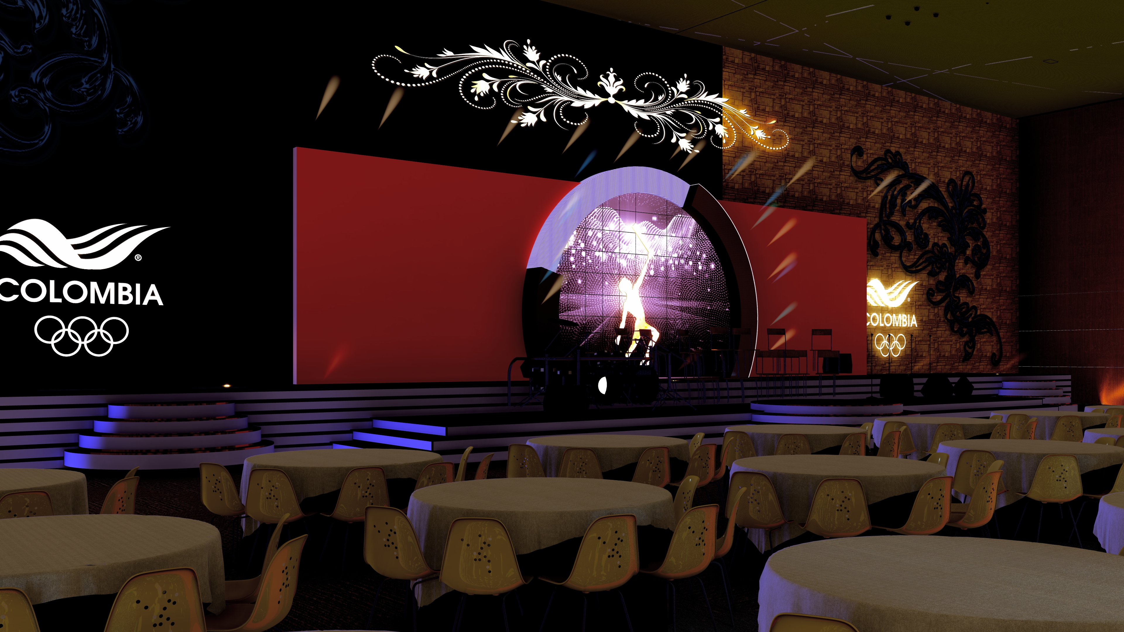 Proyecto de visualización arquitectónica y escenográfica para la ceremonia de los Premios Altius. El diseño destaca la integración de pantallas LED de gran formato y la disposición del mobiliario para un evento de gala de alto nivel.